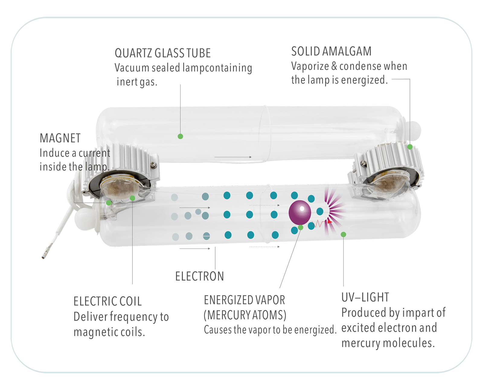 The induction coil produces a very strong magnetic field which travels through the glass and excites the mercury atoms in the interior. The mercury atoms are provided by the amalgam (a solid form of mercury). The excited mercury atoms emit UV light of 253.7 from the quartz lamp envelope.