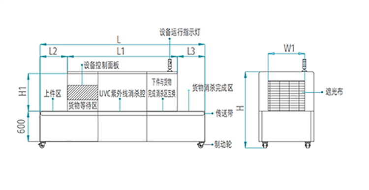 产品设计:输送带采用高强度细丝网链设计,对物品表面全方位、无死角消杀;多重抗紫外线幕帘设计,有效防止紫外泄漏,保障安全。