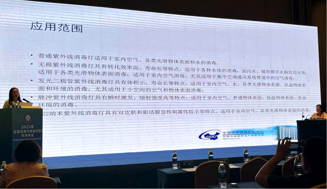 中国疾控中心环境所消毒与感染控制中心主任沈瑾主任作“紫外线消毒灯卫生要求标准研究进展”课题报告中,重点提出无极紫外消毒灯特点及使用范围,引发了与会者的强烈关注。