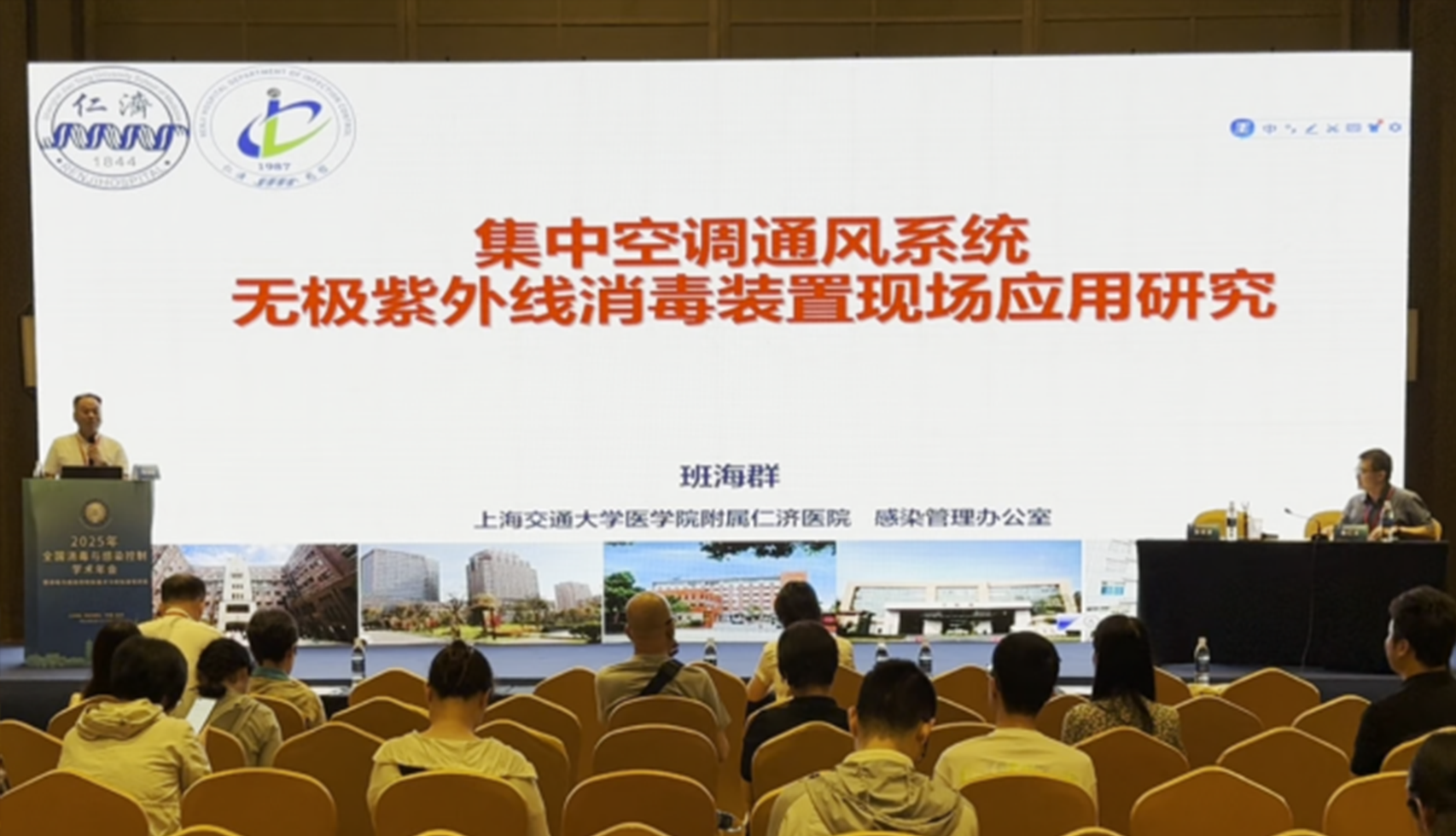 上海交通大学医学院附属仁济医院院感科班海群主任在会上作“集中空调通风系统无电极紫外线消毒装置现场消毒应用研究”专题报告。该研究证明支持了无极紫外线消毒装置安全可靠,在有人的环境中,具备人机共存、实时消毒的优势,可有效杀灭回风中的微生物,显著降低医疗机构室内环境病原体传播风险。该项成果为动态空气消毒提供了扎实的科学依据,引起与会专家的高度关注。